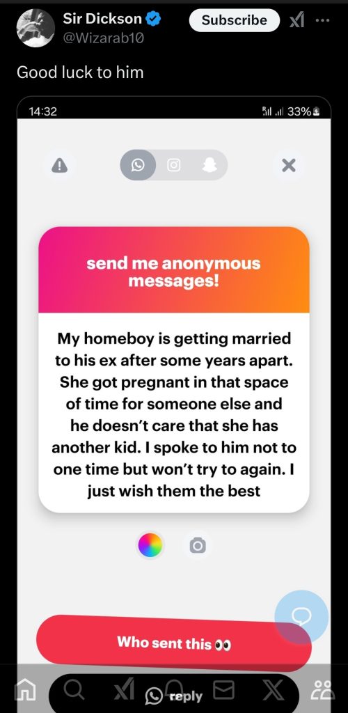 His statement: “My homeboy is getting married to his ex after some years apart. She got pregnant during that time for someone else, and he doesn’t care that she has another kid. I spoke to him about it once, but I won’t try again. I just wish them the best.”