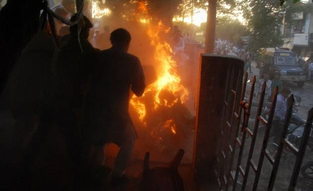 Indian bystanders attempt to douse the blaze as Bahujan Samaj Party, (BSP)Kamruzzama Fauji and a man named by police as Durgesh Kumar Singhb are engulfed in flames during an election television debate in a local park in Sultanpur, a town about 160 kilometres (100 miles) from the city of Lucknow. A television debate show in northern India has ended in horror after a spectator set himself ablaze and embraced a local politician, leaving both men fighting for their lives, police and a witness told AFP. The election show on India’s state-owned national TV channel Doordarshan was being recorded in a park on in Sultanpur, a town about 160 kilometres (100 miles) from the city of Lucknow. AFP PHOTO