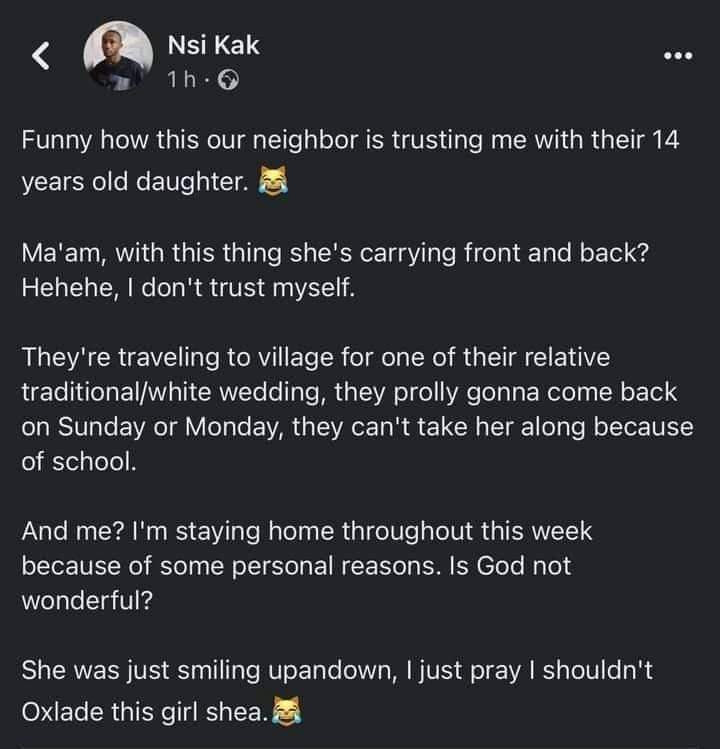 A man is trending on Facebook after he expressed his thoughts towards a 14-year-old neighbour.