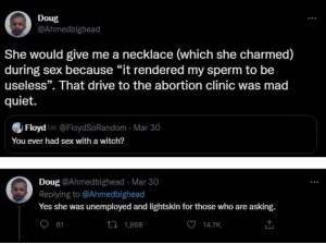“She would give me a necklace (which she charmed) during s3x because “it rendered my sprm to be useless”. That drive to the abrtion clinic was mad quiet.