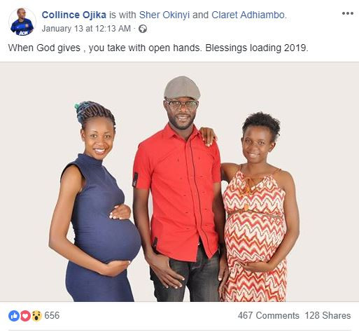 A Kenyan man identified as Collince Ojika is being hailed on social media after she shared a of himself with his two wives who are heavily pregnant.
