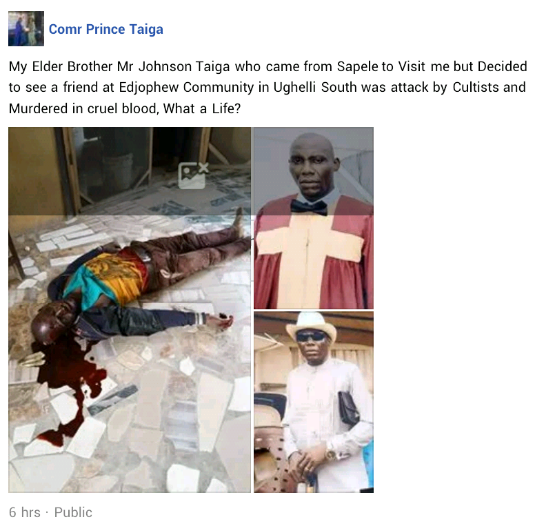 Speaking on the brutal murder of his older brother, the chairman of CDHR Taiga, lamented the uncontrollable activities of cultists and other criminal elements within the Udu and Ughelli South axis of the state, calling on security agencies in the state, especially the police, to step up their games and save lives of the innocent.