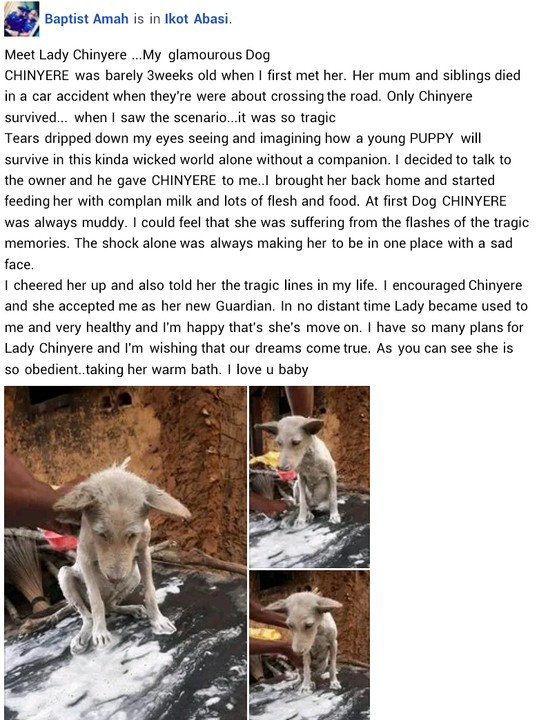 I cheered her up and also told her the tragic lines in my life. I encouraged Chinyere and she accepted me as her new Guardian. In no distant time Lady became used to me and very healthy and I’m happy that’s she’s move on. I have so many plans for Lady Chinyere and I’m wishing that our dreams come true. As you can see she is so obedient..taking her warm bath. I love u baby.