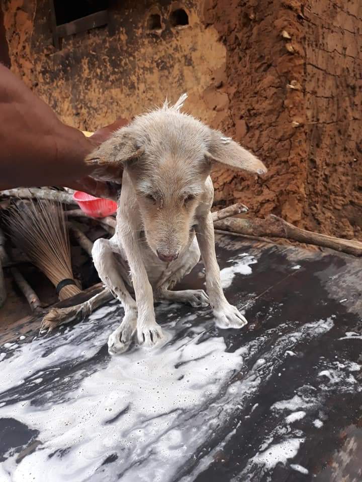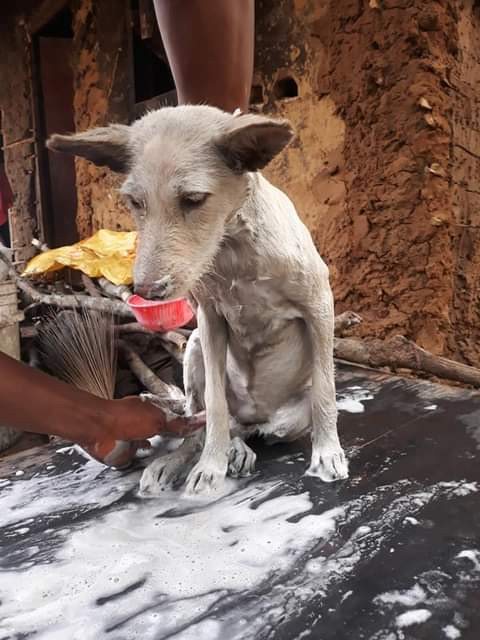 Tears dripped down my eyes seeing and imagining how a young PUPPY will survive in this kinda wicked world alone without a companion. I decided to talk to the owner and he gave CHINYERE to me..I brought her back home and started feeding her with complan milk and lots of flesh and food. At first Dog CHINYERE was always muddy. I could feel that she was suffering from the flashes of the tragic memories. The shock alone was always making her to be in one place with a sad face.