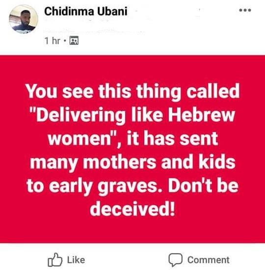 Facebook user, Chidinma Ubani advised women to stop risking their lives because they want to deliver like the biblical Hebrew women, and pointed out that so many women have died as a result.