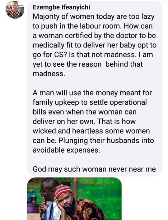 But Ezemgbe Ifeanyichi did not agree with the advice and he called out women who opt for Caesarean Section.