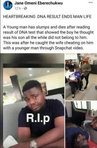 According to supposed friends of the deceased who gave their opinions online, the abroad-based man caught his with cheating another man on Snapchat, so he returned to Nigeria and conducted a paternity test on his son, only to get an unfavourable result.