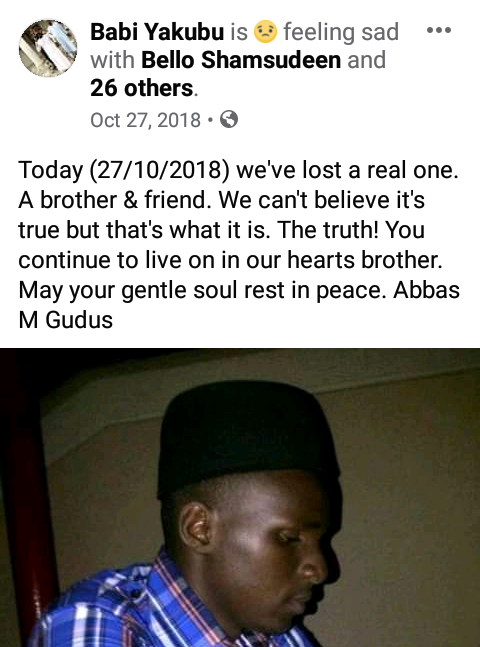 “Today (27/10/2018) we’ve lost a real one. A brother & friend. We can’t believe it’s true but that’s what it is. The truth! You continue to live on in our hearts brother. May your gentle soul rest in peace. Abbas M Gudus”