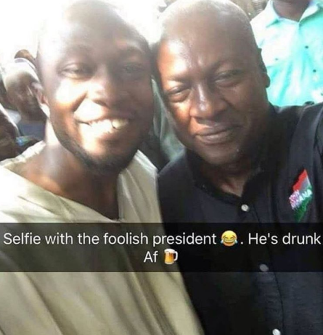 The man took a selfie with President of Ghana, John Dramani Mahama, shared the pic on Snapchat and called him a foolish president and also said he was drunk…lol. How disloyal!