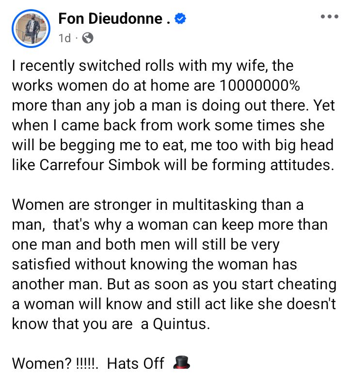 “Apology post. I want to publicly apologize to my wife for not celebrating her enough for taking care of three kids in a country as Cameroon in my absence for all the years that I was in the USA,” he wrote.