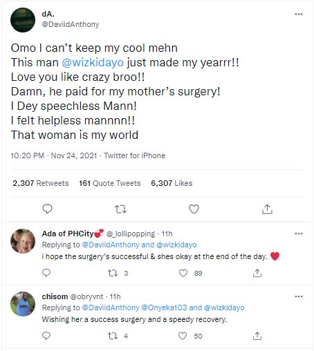 According to David Anthony, the musician helped pay for his mother’s operation. He expressed his heartfelt thanks to Wizkid in a Twitter post and wrote: