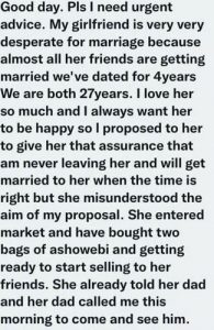 “Good day. Pls I need urgent advice. My girlfriend is very very desperate for marriage because almost all her friends are getting married we’ve dated for 4years We are both 27years. I love her so much and I always want her to be happy so I proposed to her to give her that assurance that am never leaving her and will get married to her when the time is right but she misunderstood the aim of my proposal.