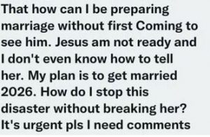 She entered market and have bought two bags of ashowebi and getting ready to start selling to her friends. She already told her dad and her dad called me this morning to come and see him. That how can I be preparing marriage without first Coming to see him. Jesus am not ready and I don’t even know how to tell her. My plan is to get married 2026. How do I stop this disaster without breaking her? It’s urgent pls I need comments “