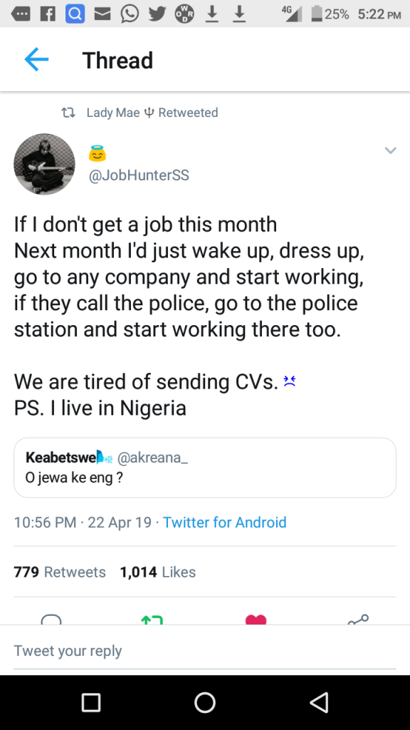 A man has threatened to resume into any company if he fails to get a job this month.The tweet though hilarious is a reminder of stark consequence of unemployment in Nigeria.