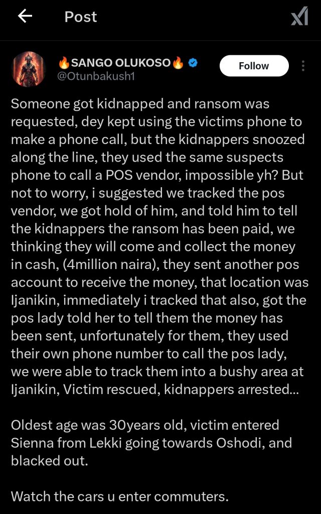 In the viral post, @Otunbakush1 detailed how he was able to uncover the kidnappers’ location and secure the victim’s release.