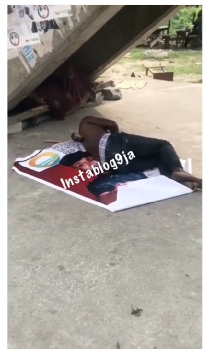 Man turns Banky W’s campaign poster into a sleeping mat in Ajah, Lagos…