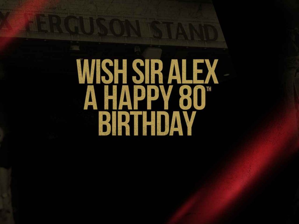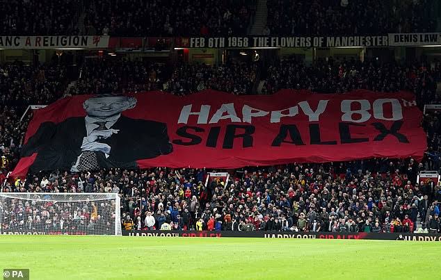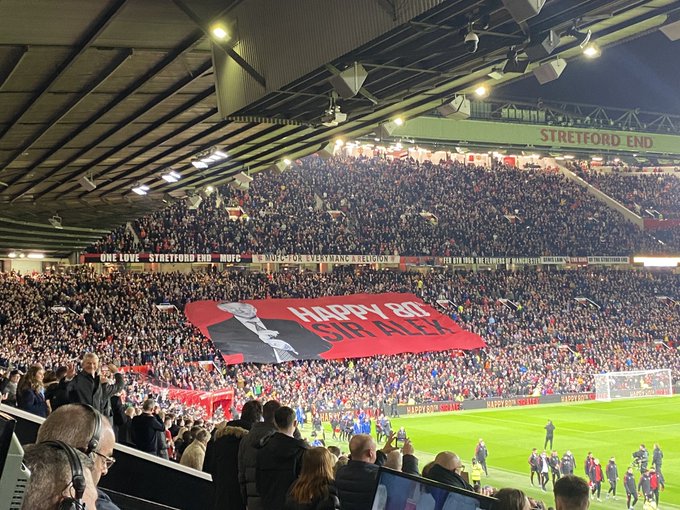 A birthday banner for Sir Alex Ferguson is unveiled in the Stretford End. He’s 80 tomorrow.