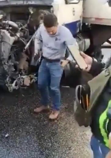 The man walked out of the car unharmed like nothing happened while checking if his phone and wallet were intact.