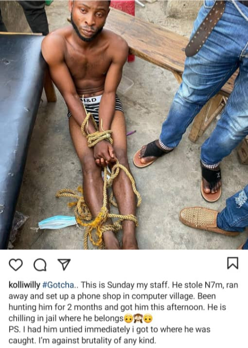The employer, Kola Adesina took to Twitter to share a photo of the man, stripped to his underwear and tied hands and feet after he was caught.