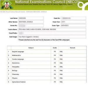 Mayowa Joshua Amusan revealed that he had straight F9 in his NECO exam. He shared his result sheet as proof.