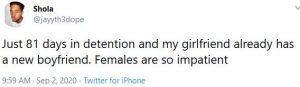 He tweeted: “Just 81 days in detention and my girlfriend already has a new boyfriend. Females are so impatient.”