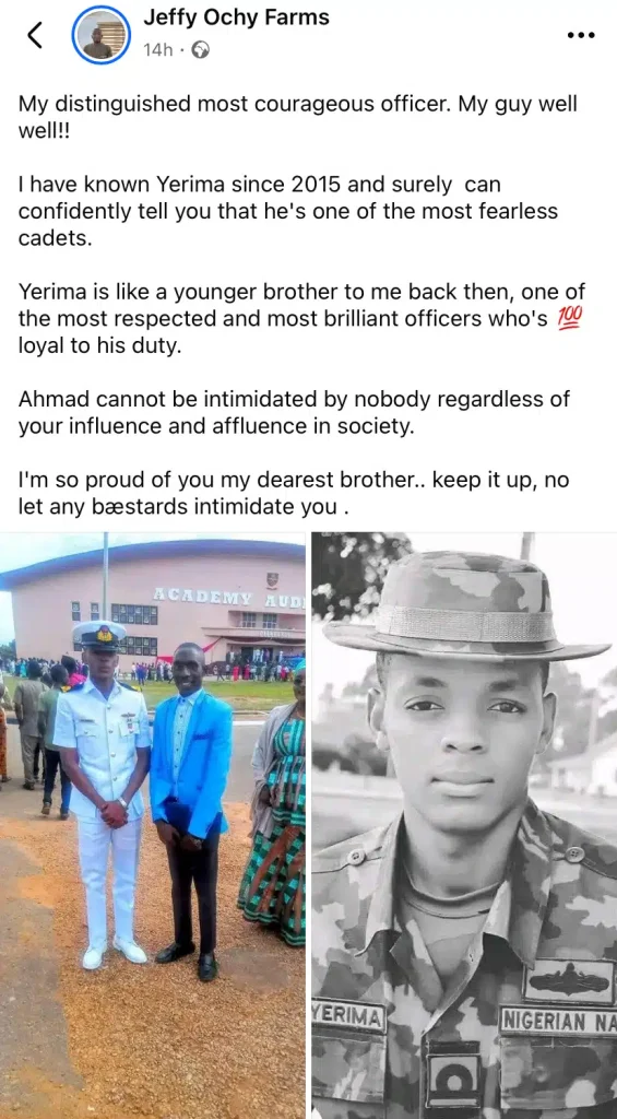 Sharing a photo of himself with the officer, Jeffy described Yerima as “like a younger brother” and praised his intelligence, dedication, and loyalty as a naval officer.