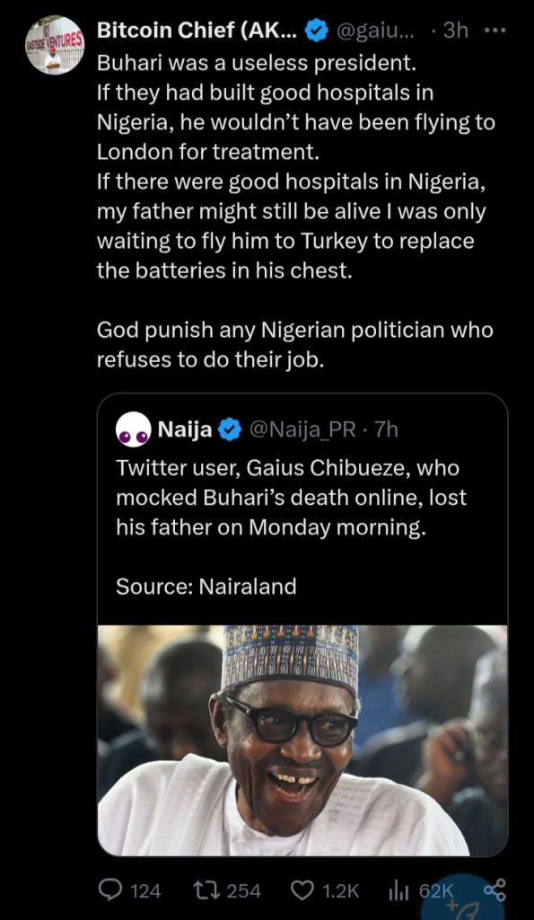 It was earlier reported that the man had announced his dad’s passing after he mocked the late Nigerian leader who died on Sunday.