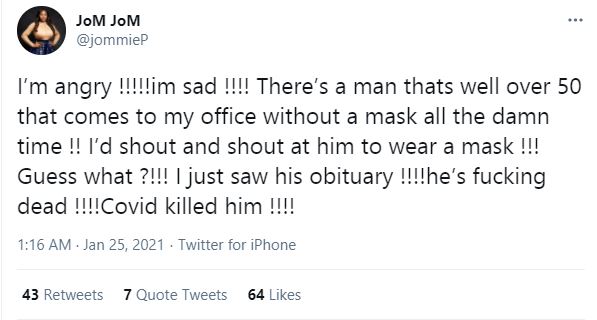 “I’m angry !!!!!im sad !!!! There’s a man thats well over 50 that comes to my office without a mask all the damn time !! I’d shout and shout at him to wear a mask !!! Guess what ?!!! I just saw his obituary !!!!he’s fucking dead !!!!Covid killed him !!!!