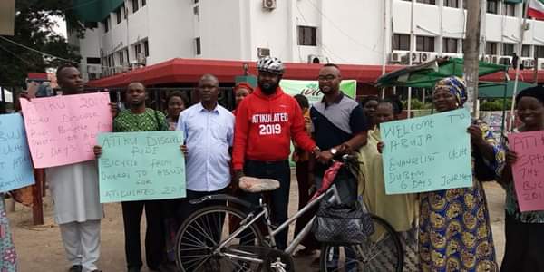 Evangelist Uche Dubem has arrived Wadata House,Abuja. He cycled with a bicycle from Owerri to Abuja to congratulate Atiku. It took him 6 days…