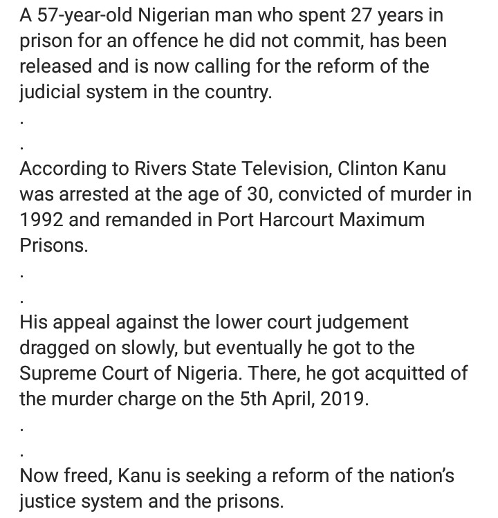 Man who spent twenty-seven years in jail for crime he didn’t commit released in Rivers State.