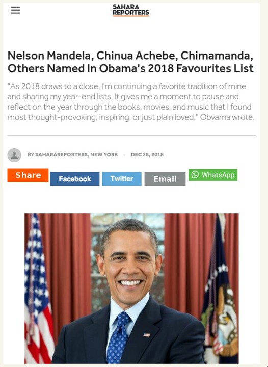 Nelson Mandela, Chinua Achebe, Chimamanda, Others Named In Obama’s 2018 Favourites List