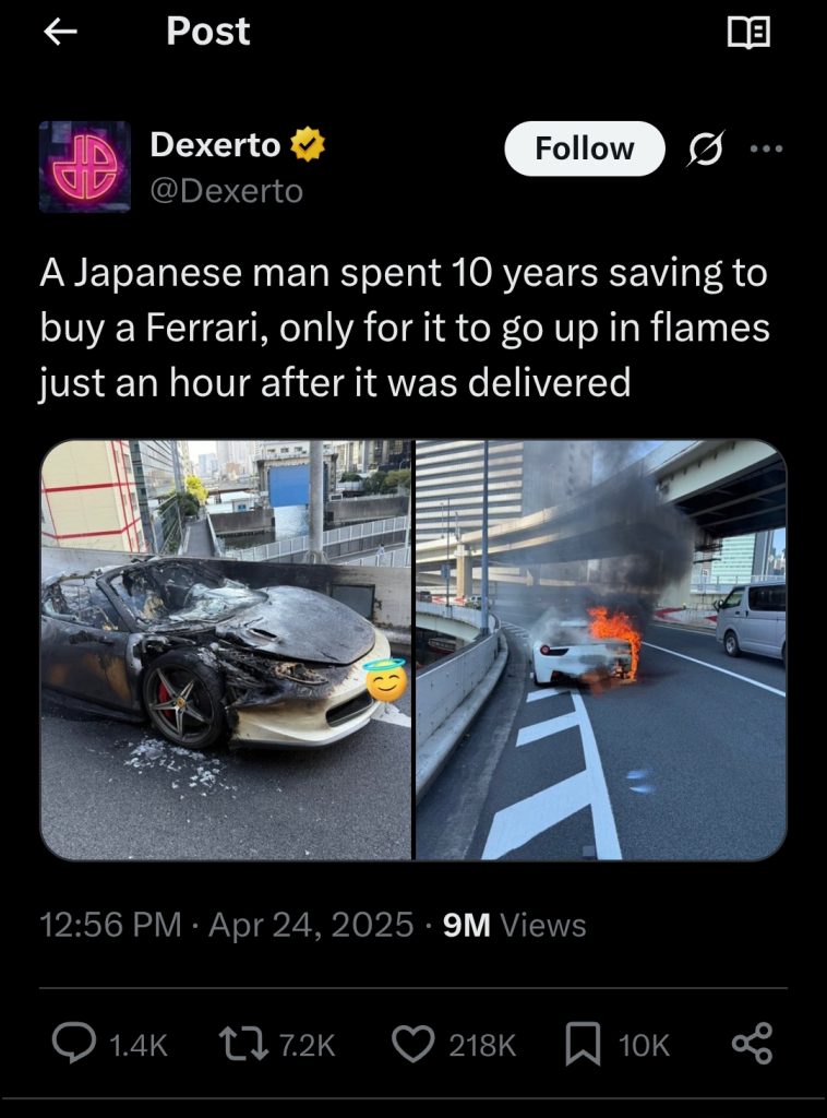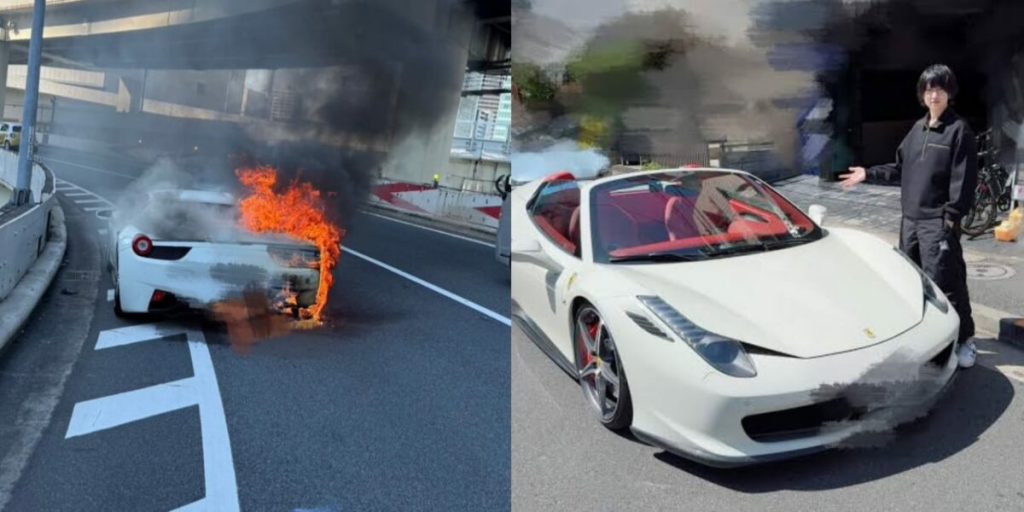 A Japanese man spent 10 years saving for his dream car, a Ferrari 458 Spider, but just an hour after acquiring it, the luxury vehicle caught fire and was destroyed.