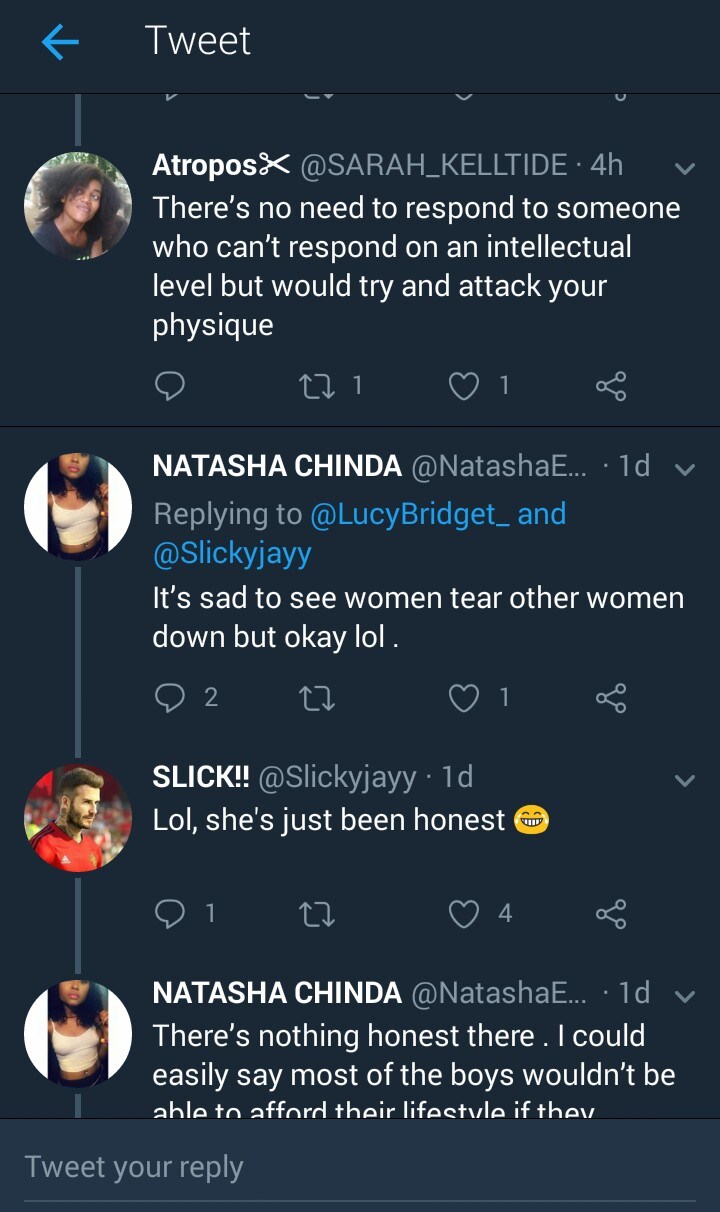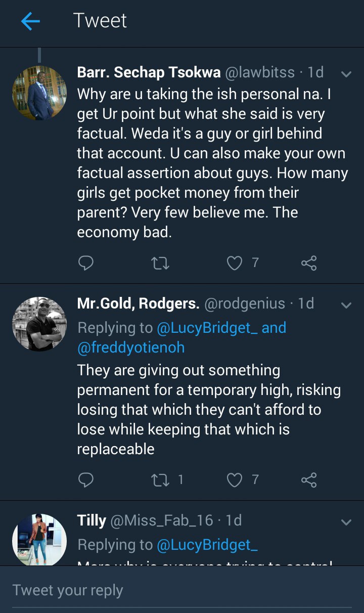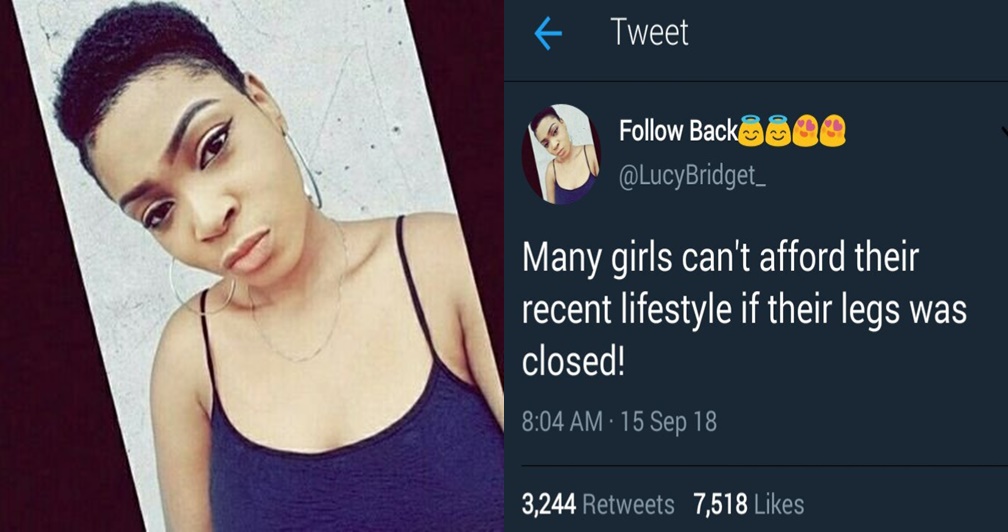A Nigerian lady identified as @LucyBidget_ on Twitter has taken to the platform to tongue lash ladies whose lifestyle doesn’t give liberty to their legs to say no to men.