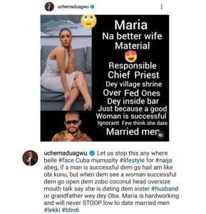 Uche in a post shared on his IG page stated that Maria can never stoop low to date a married man.