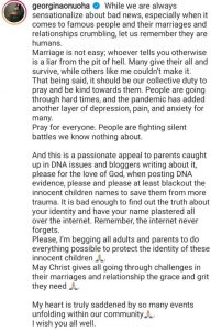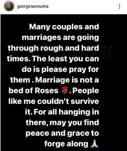 In a post shared on her Instagram page, Georgina said people are facing difficult times in their marriages and the only thing people should do is pray for them. She mentioned that people like her couldn’t survive marriage as it isn’t a bed of roses.