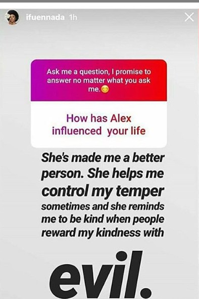 Ifu Ennada who held a question and answer session on her Instagram page, disclosed that marriage is not her priority. Ifu Ennada who further revealed how Alex has influenced her life as she stated that marriage is not her priority, said Alex helped her to become a better person, control her temper and also reward people with kindness even when they pay back with evil.