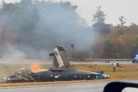 Photos from the scene show the charred and mangled single-engine SOCATA TBM 700 surrounded by first responders in the grassy median of the highway. State police said the plane burst into flames once it hit the ground.