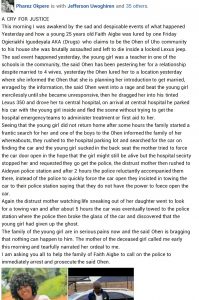 “Again the distrust mother watching life sneaking out of her daughter went to look for a towing van and after about 5 hours the car was eventually towed to the police station where the police then broke the glass of the car and discovered that the young girl had given up the ghost