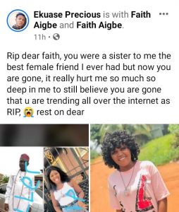 Read below: “This morning I was awakend by the sad and despicable events of what happened Yesterday and how a young 25 years old Faith Aigbe was lured by one Friday Ogieriakhi Iguodeyala AKA (Drugs) who claims to be the Ohen of Uho community to his house she was brutally assaulted and left to die inside a locked Lexus jeep