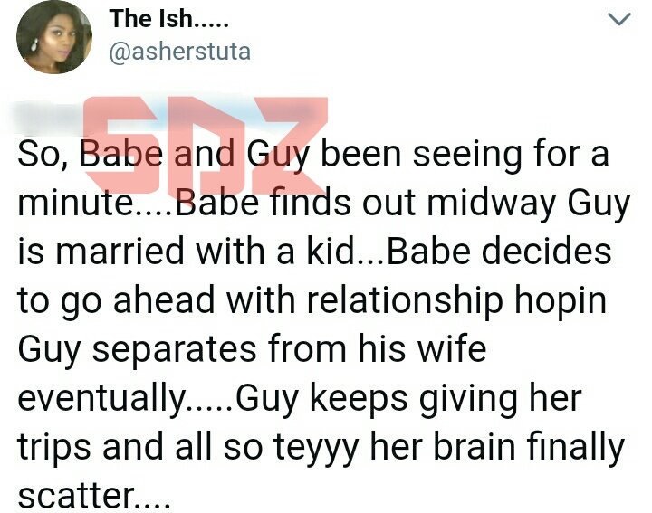 every girl dating a married man thinks all her problems have been solved, Buh not until you meet this type.. Issa Professional duper.. Lol.. A Twitter user Asher has revealed how a girl got duped by her married lover.. Lemme not go far you need to read for yourself..