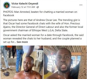 The man identified Andrew Lee Oscar was reportedly beaten after he was caught allegedly chatting with wife of a politician in Delta State on Facebook.