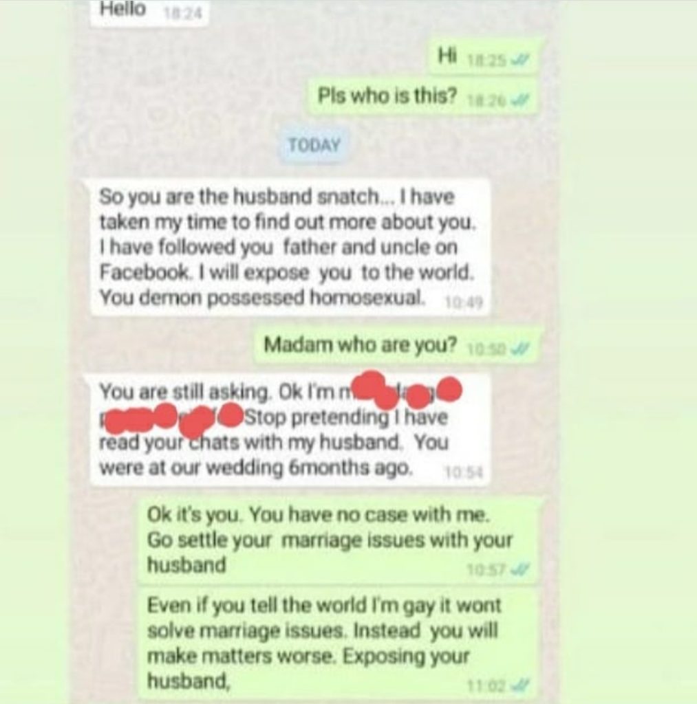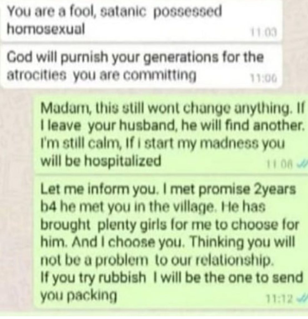A woman who is afraid of losing her husband to a man has challenged him. It all happened in a Whatsapp conversation as the woman queried the gay man for having an affair with her husband.