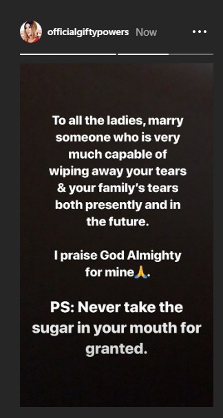 Gifty who told her followers to marry men who can wipe away their tears and that of their family, added that they should never take the sugar in their mouth for granted. She wrote;
