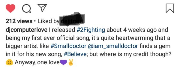 According to the DJ, “2 Fighting” was released barely 4 weeks ago, but to his utter shock, Small Doctor released a new song titled “Believe” 5 days ago and it happened that the “Penalty” singer used an integral part of “2 Fighting” and garnished it with “hain, hain hain, hain”.