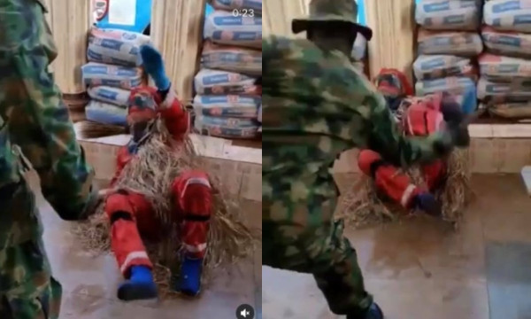 A masquerade got more than he bargained for as an alleged provocation fetched him some cane moment from a Nigerian soldier.