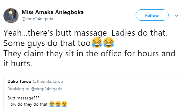According to her tweet, she said she’s tired of seeing poop in men’s butt hole when they come for massage and these same men are the ones who specifically ask for a butt massage.