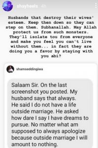 “Husbands that destroy their wives’ esteem. Keep them down so they can step on them. Subhanallah. May Allah protect us from such monsters.