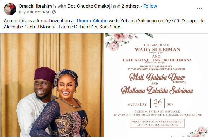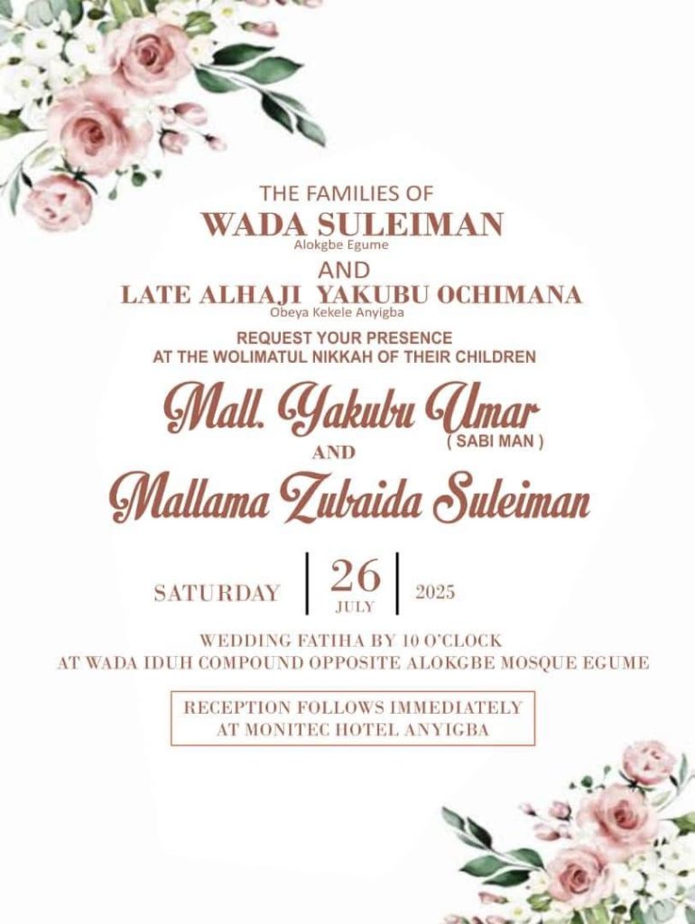 The businessman will marry Zubaida Suleiman on July 26, 2025 in Kogi State.