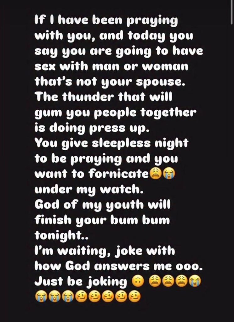 “If I have been praying with you, and today you say you are going to have sex with a man or woman that’s not your spouse. The thunder that will gum you people together is doing a press-up. You give sleepless nights to be praying, and you want to fornicate under my watch.