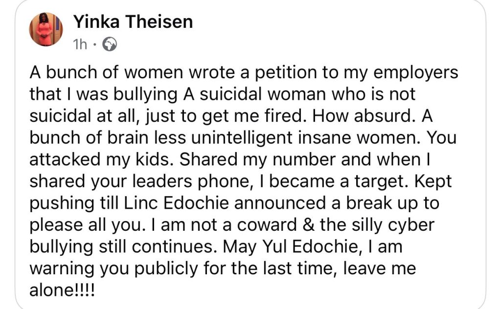 Yinka Theisen, the ex-lover of Linc Edochie, has once again taken to social media to call out May Yul-Edochie, the estranged wife of actor Yul Edochie.